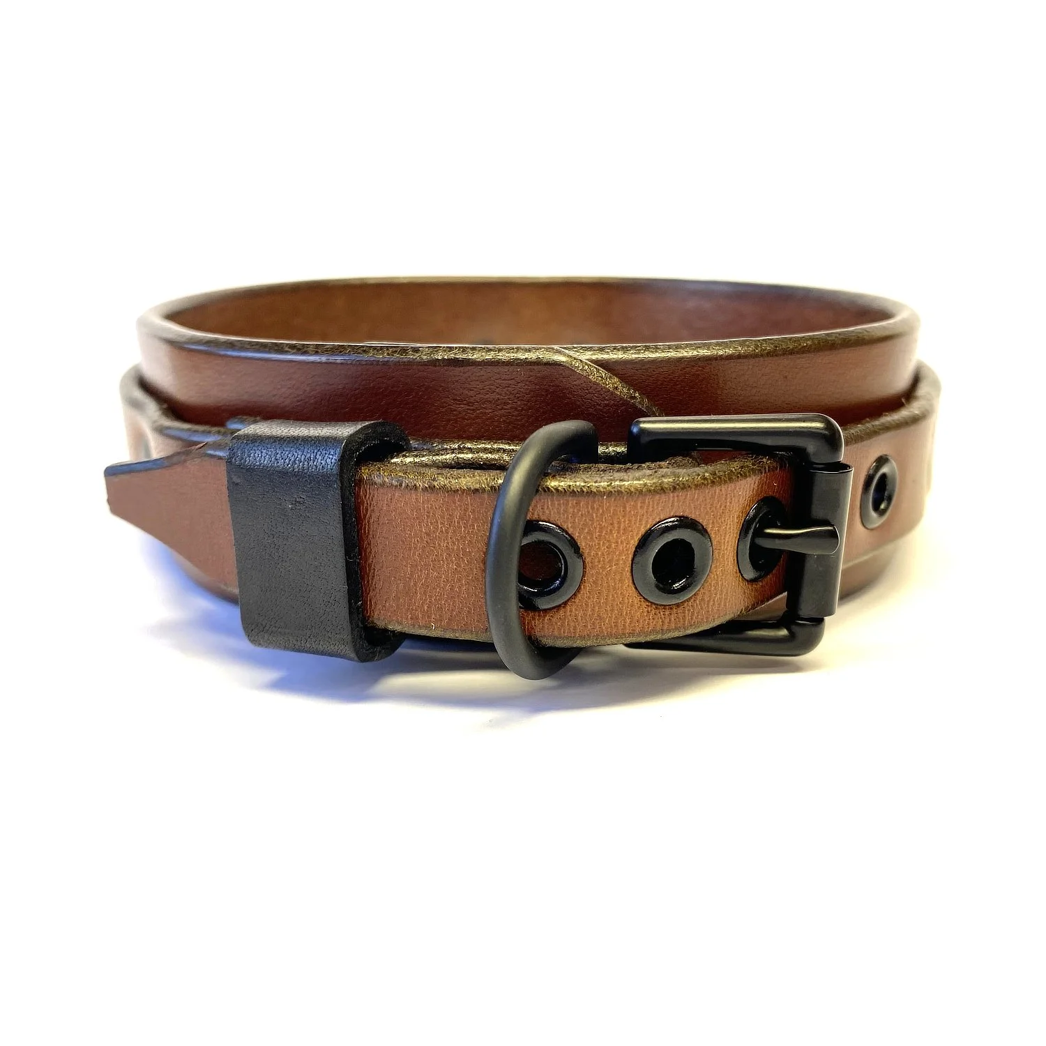 1.5" wide Brown Bridle Leather BDSM Collar fitted with a 3/4" Black D-ring in front and Black Hardware. 6 Brown Leather options. Custom sized, Lockable option