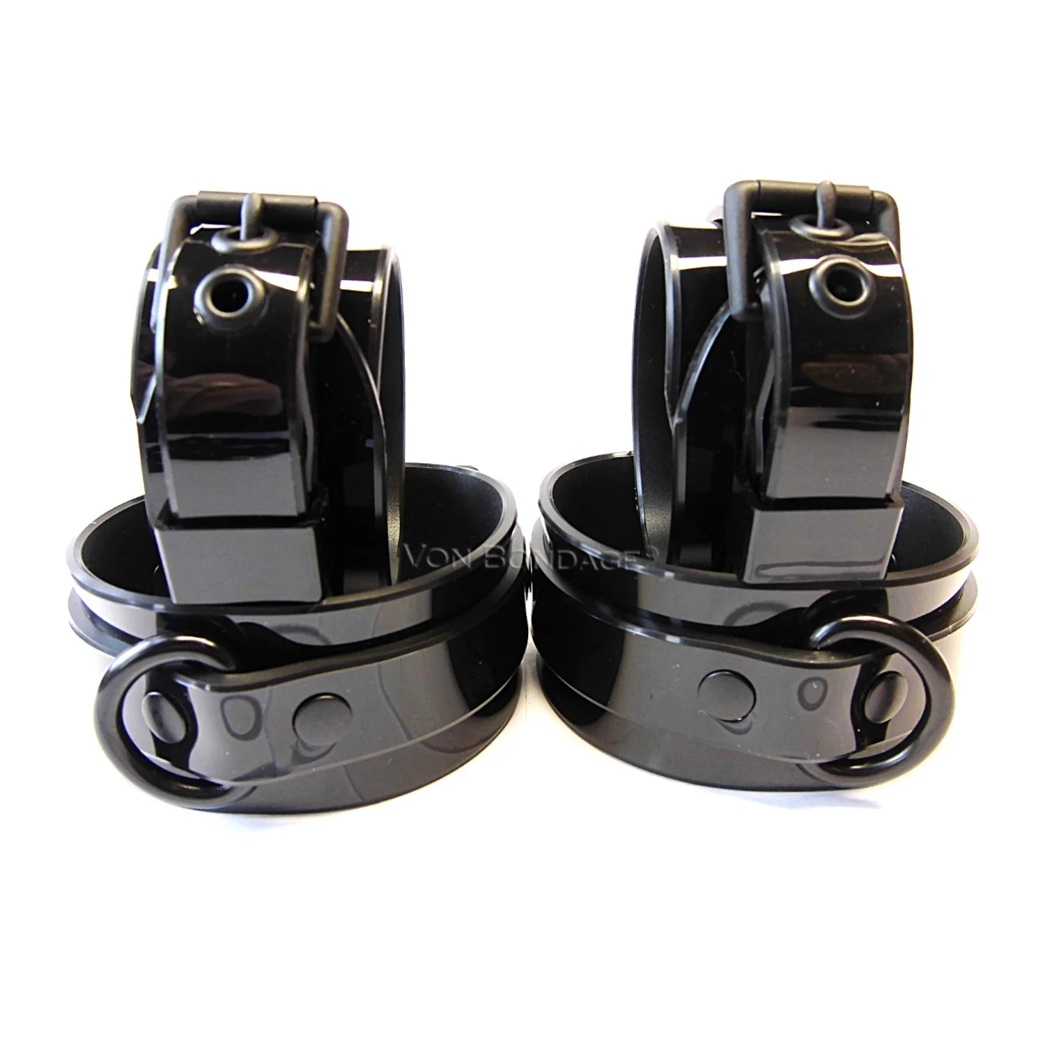 Patent Leather Sides These super shiny chrome-tanned patent leathers are from about 1.5-2mm thick (3.5-4oz). I bond them to the Supersoft Arizona leather sides I have in stock which are kept for the patents and the colored leathers. These patents have a highly lustrous baked enamel appearance and a heavy finish which resists piping. Other patent leathers may be left with ugly creases when bent, but my supplier’s tannery has perfected the finish on the patent leather to prevent piping. Because of its chrome tannage, this patent leather is softer and bends easier than veg tanned patent leather. Once I combine the soft Arizona leather to the patent leather hides, they make for some serious thicknesses of about 8-9oz of pure sinful luxury. The patent leather lines come in earthy whorish red, and sinfully corrupt black and are very glossy on top making them PERFECT for fetish photography. The patent leathers are available by “Leather Choice” for all of my listings, but I also have a separate section for Patent Leather Restraints and Patent Leather Bondage Collars in the drop down menus and Patent Leather Collections page.