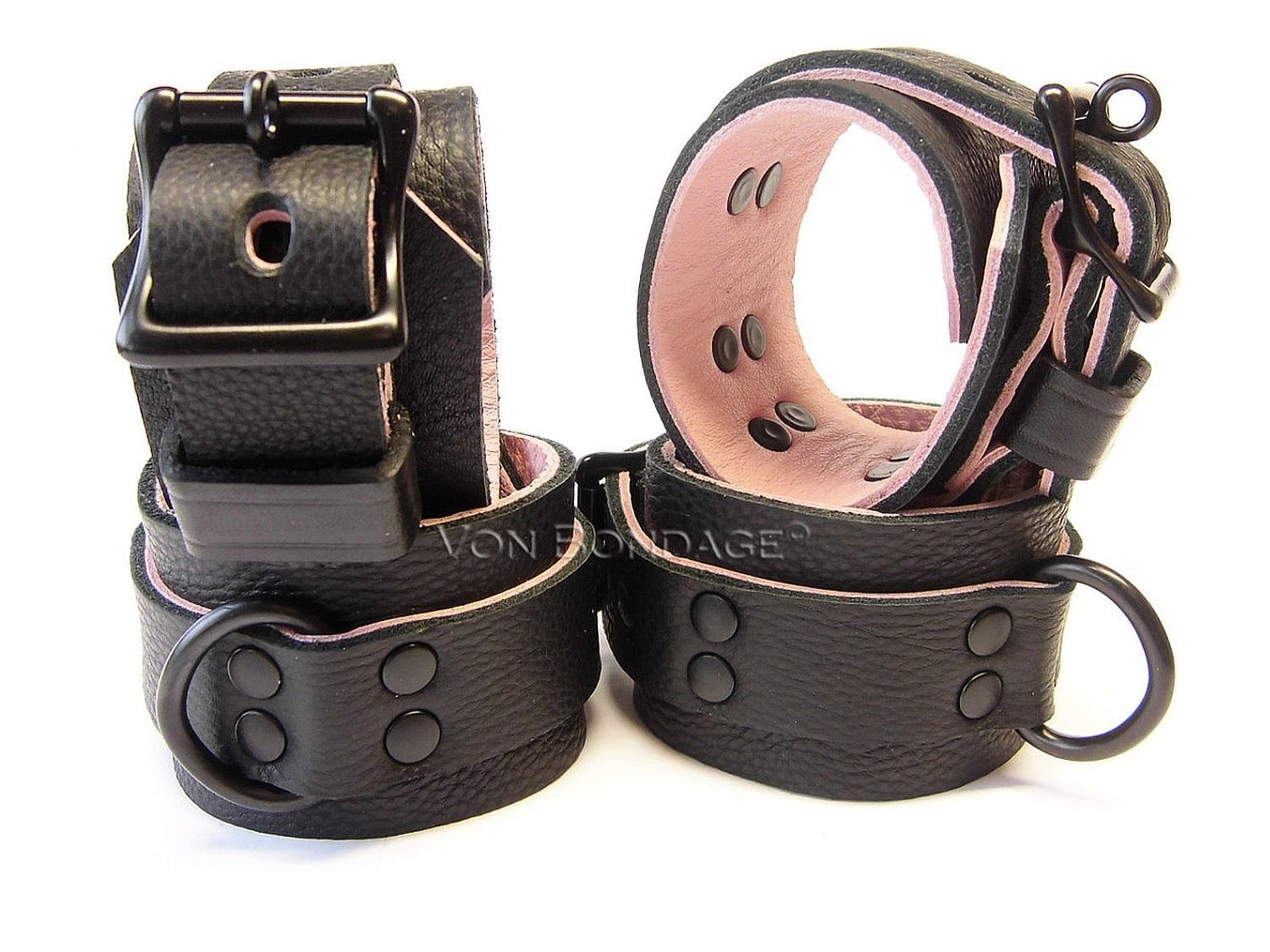 This set of Wrist & Ankle Restraints is 2” wide with 1” wide straps wrapping fully around the cuffs holding 1” wide Black Dee Rings using double-stacked black poly-coated steel rivets for slaves who have a nickel sensitivity. This set comes with the following items: